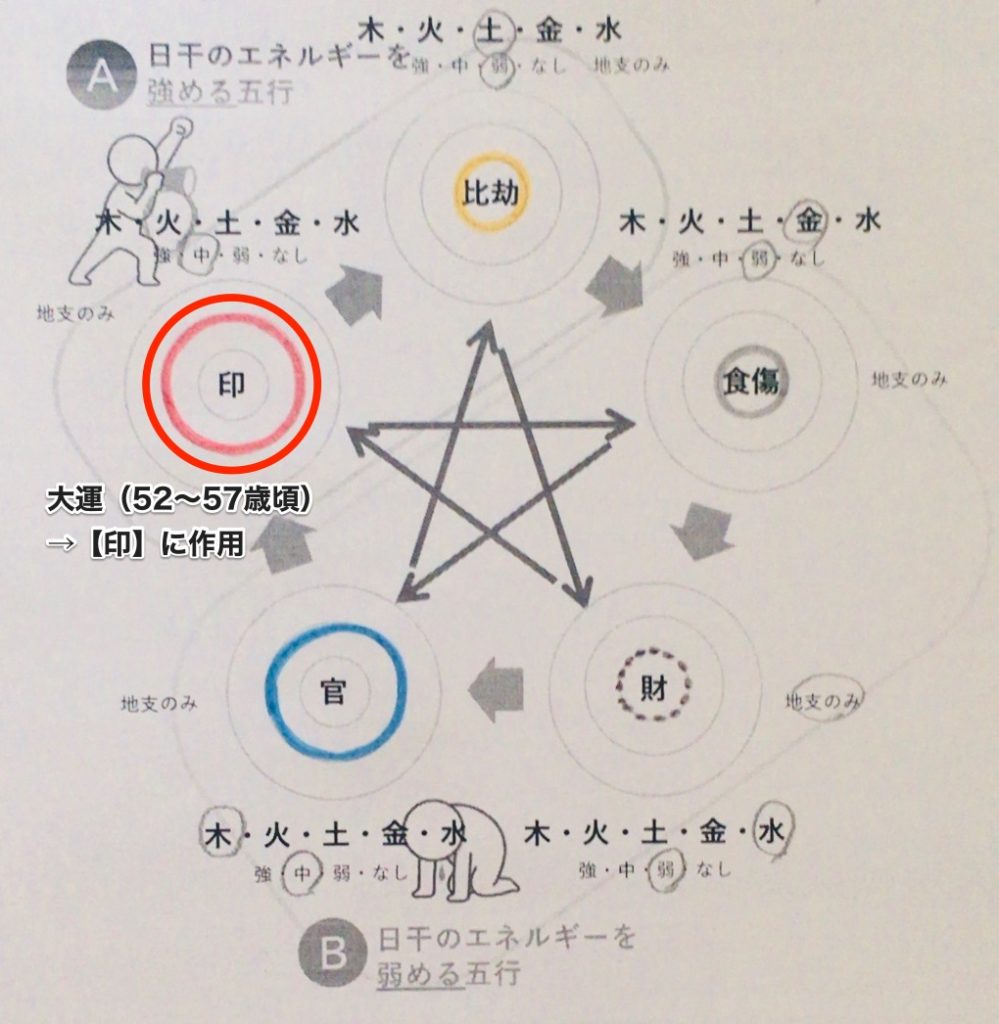 つまり、たくちゃんコーチの52歳〜57歳前後の5年間は、火の五行(印)に作用が出ます。