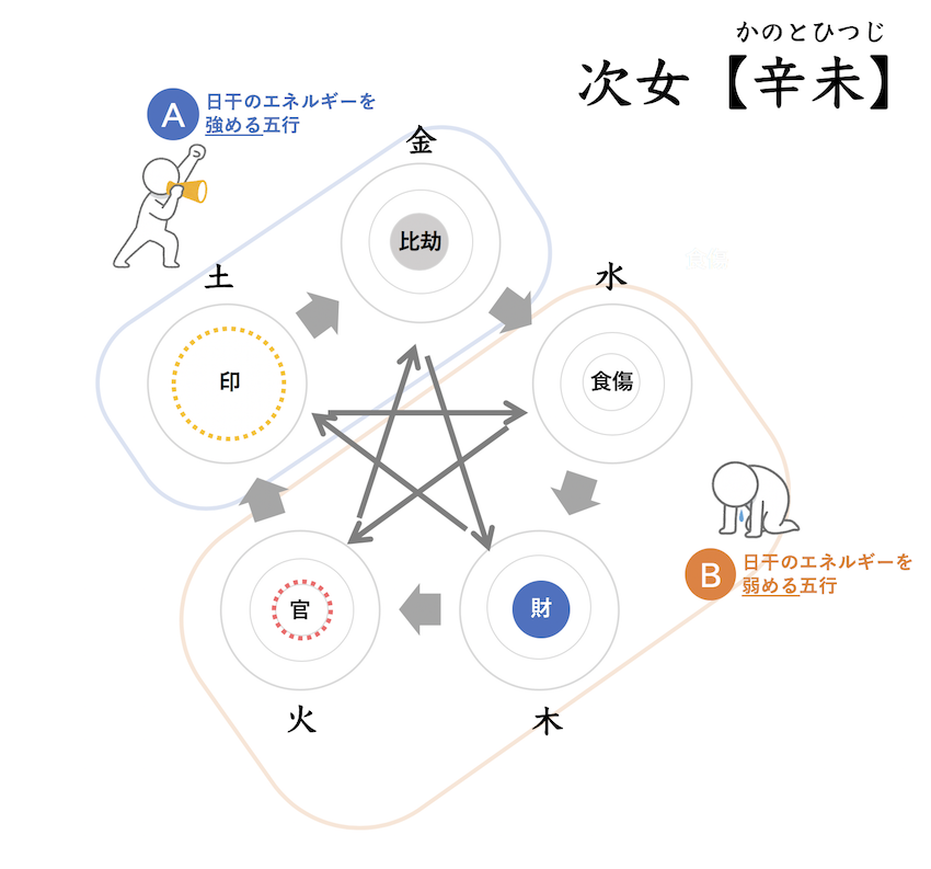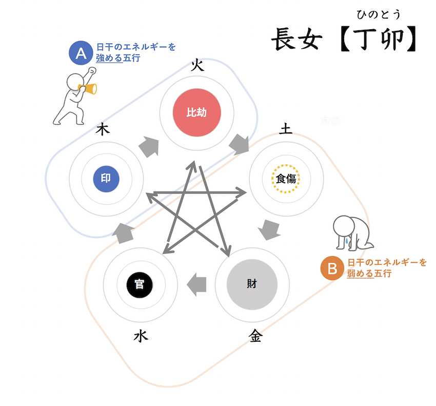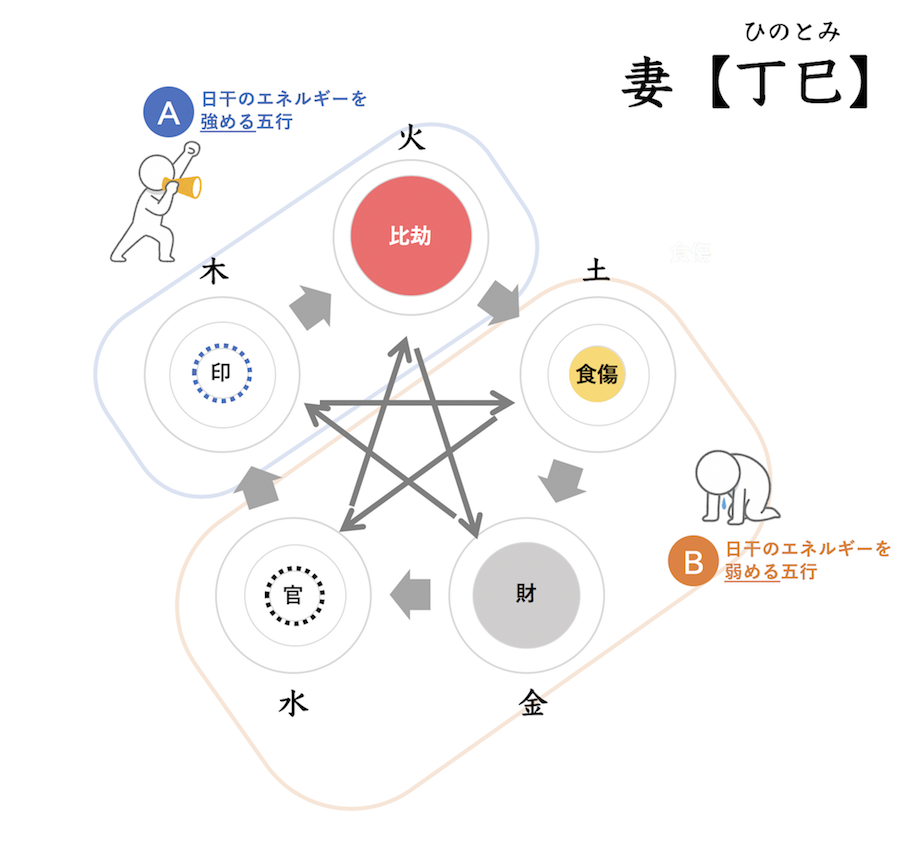 ▲妻、長女とのやりとりで心身が消耗する(※食傷は別名〝漏星〟といい、日主のエネルギーを奪う星)