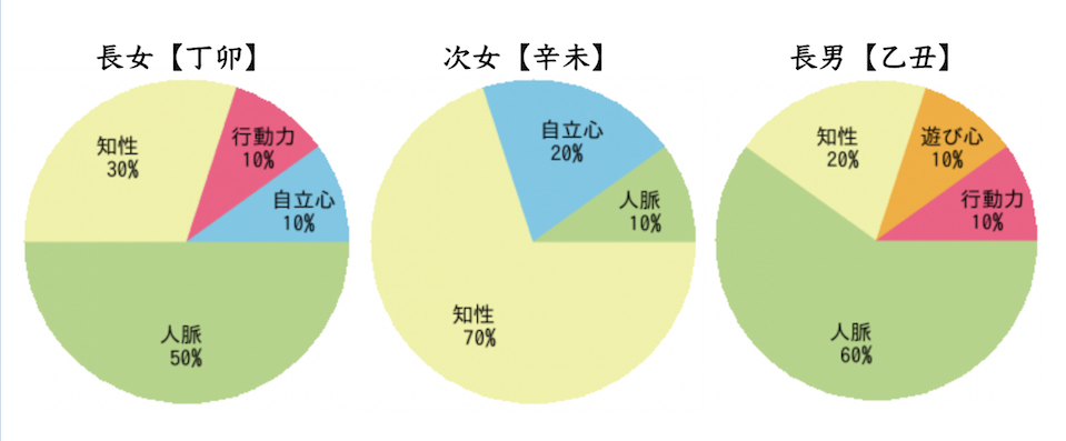 つづいて、三人のお子さんの推命パラメーター(円グラフ)と五行バランスで傾向を見て、子育てのポイントを読んでいきます♬