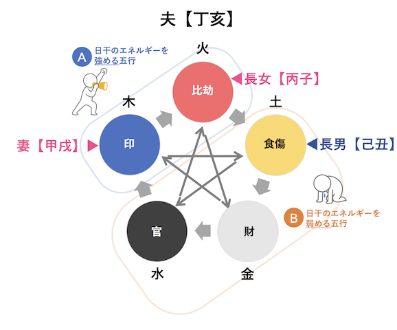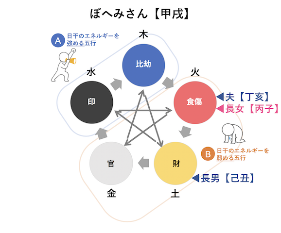 - ※補足:ぼへみさんの日主【甲】は、夫の日主【丁】にとって守護神。火を燃やす木材の関係です