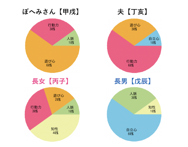 家族4人の3柱の通変星の割合を独自比率(鳥海流)で作成した円グラフを並べてみました。一目瞭然でわかりやすいですね♬