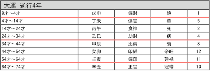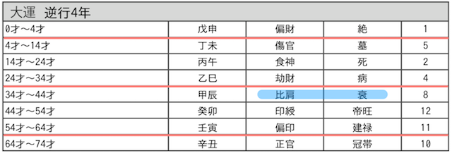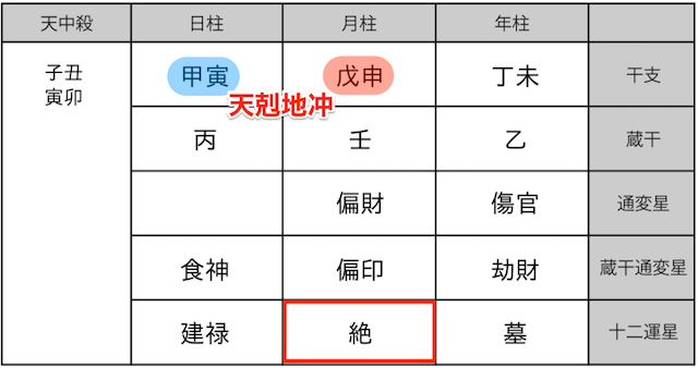 これを裏づける 天剋地冲にくわえて注目したのが、月柱にある十二運星【絶】です。