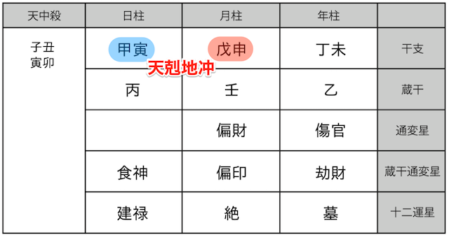 この2つが 天剋地冲 であるため、常に激しい嵐のような強いパワーを内側に抱えている命式の持ち主である、といえます。