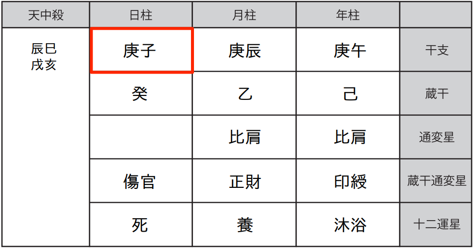命式の赤枠で囲んだ部分が、日柱の干支になります。