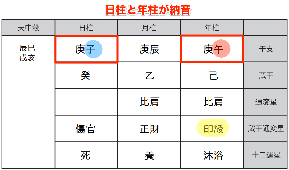 日柱の干支【庚子 かのえね】と、年柱の干支【庚午 かのえうま】の干支同士の関係を 納音 といいます。