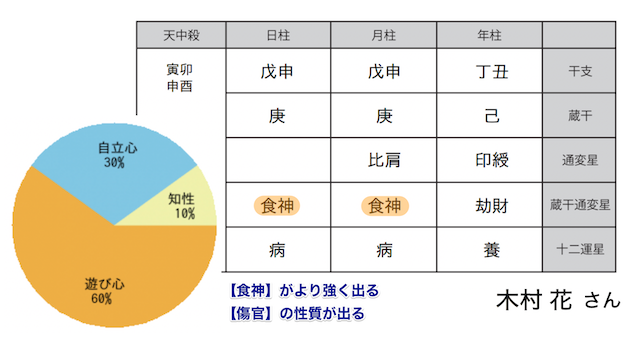 木村花さんは命式に【食神】が2つあるので、【食神】の特長が強く顕れるか、【傷官】の特長が顕れると解釈します。