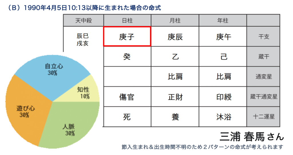 ※三浦春馬さんは節入生まれで出生時間が不明なため、2パターンの命式が考えられますが便宜上(B)の命式を使用します。ご承知おきください。