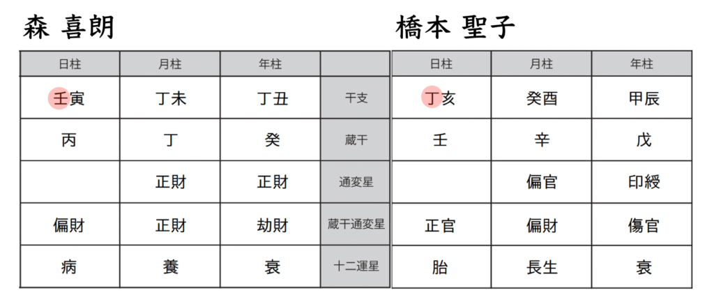 四柱推命でおふたりの命式を調べてみると、日干が干合しており「深い縁があり、離れられない間柄」であることがわかります。