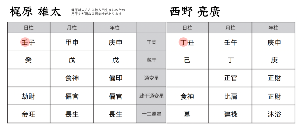 四柱推命でおふたりの命式を調べてみると、日干が干合しており「深い縁のある間柄」であることがわかります。