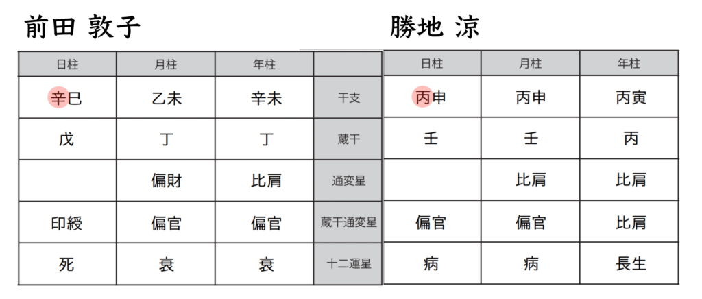 前田敦子さんの日干【辛 かのと】と、勝地涼さんの【丙 ひのえ】は、干合です。