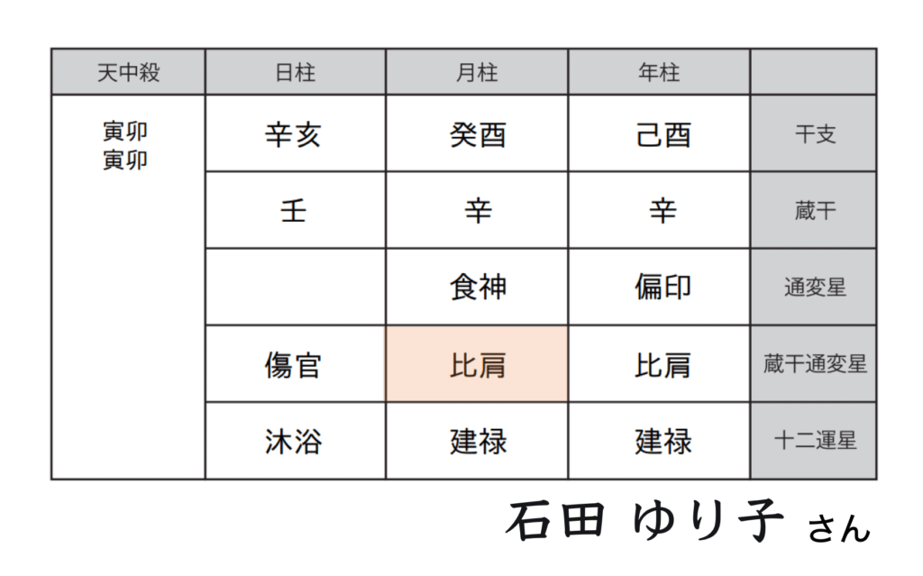 日柱では、その人のプライベート運(家庭運・恋愛運)を読むため、とくに通変星【比肩】が日柱にある方に強く顕れます。
