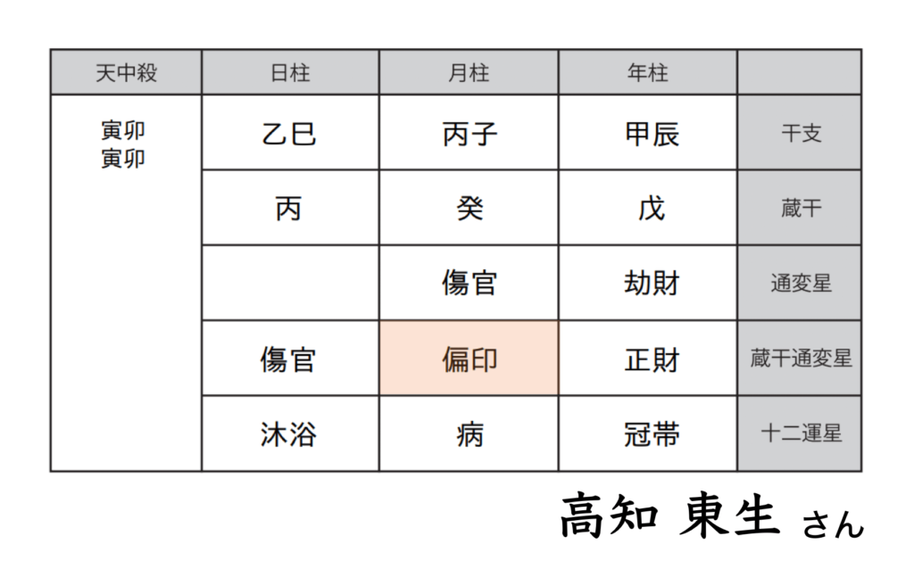 日柱では、その人のプライベート運(家庭運・恋愛運)を読むため、とくに通変星【偏印】が日柱にある方に強く顕れます。