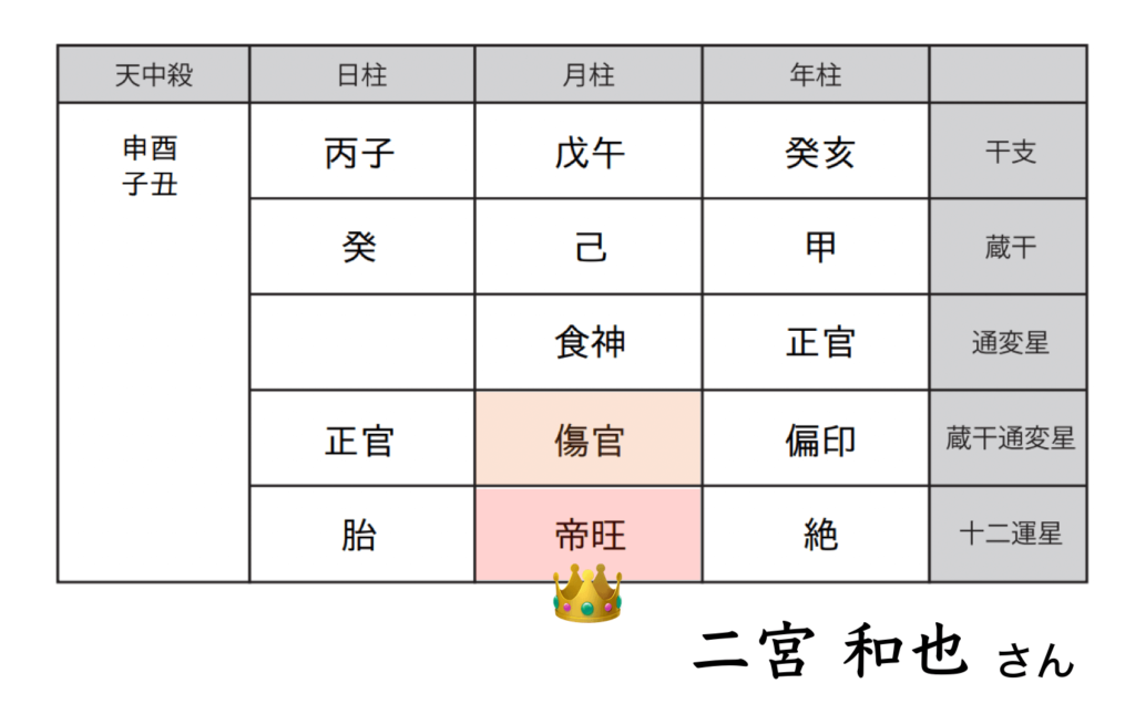 中心星【傷官】と、運勢エネルギーが最大の【帝旺】の二宮和也さん。