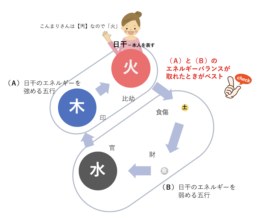 反対に、日干のエネルギーを強めてしまう五行が運(大運や年運)で巡れば、運気は悪くなり、悪い現象が生じます。