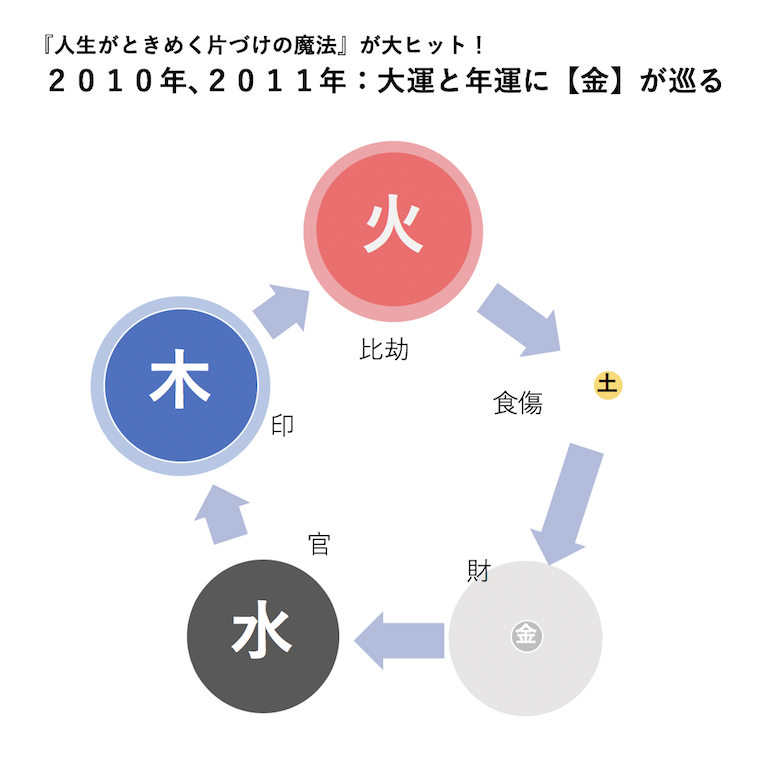 執筆当時のこんまりさんは、数えで27歳。当時の21歳〜31歳の大運は【辛未】で「金」の五行が巡っていました。