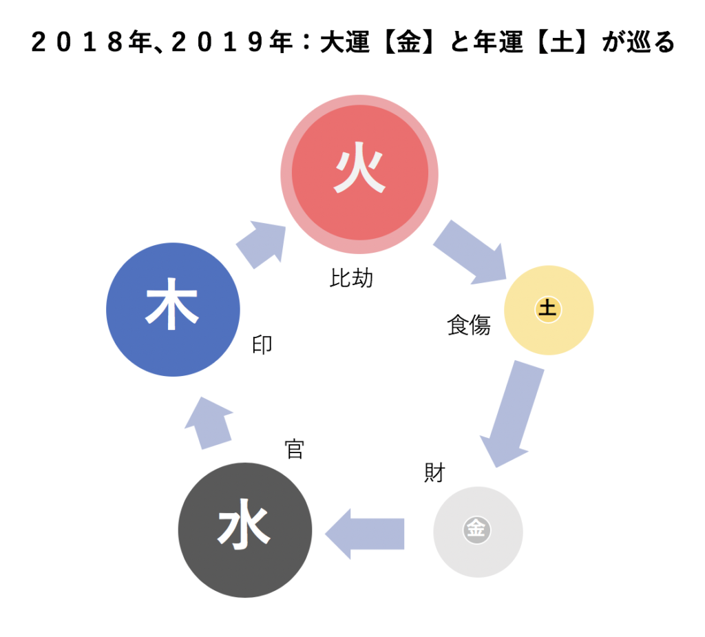 「土」の五行が強まる2018年、2019年の命式全体の五行バランスを示した図がこちらです。