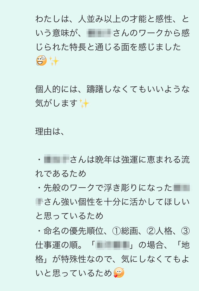 とても興味深かったのは、Yさんの命名コンセプトが、四柱推命鑑定から分かるYさんの資質や行動指針、今後の運勢で必要なアクションなどと重なっていた点です。