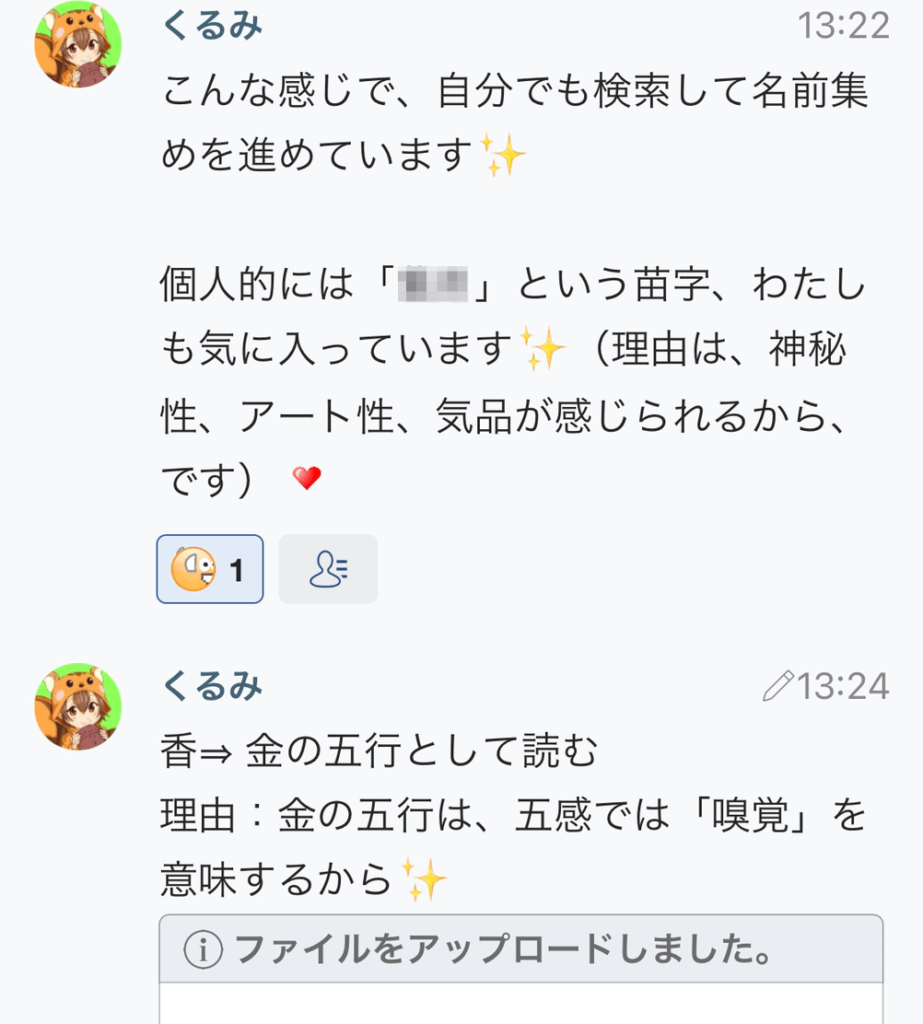 ChatWorkでのやりとりは、お名前が生まれるまでの貴重な記録でもあります。