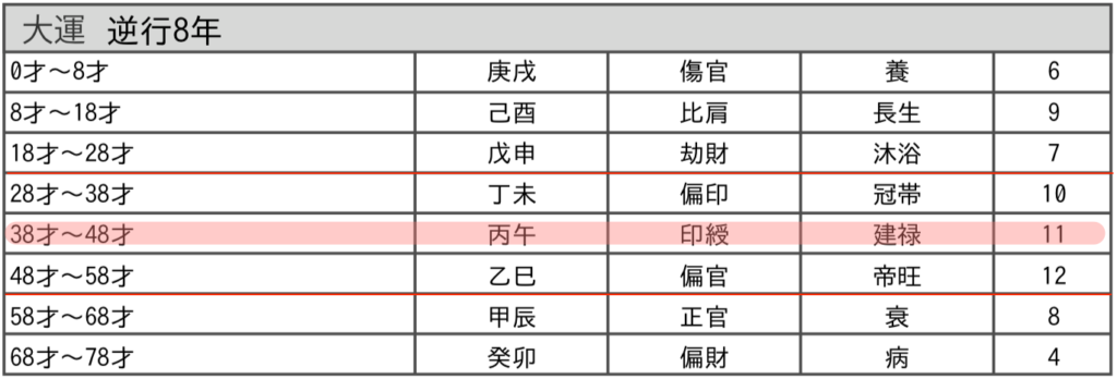 こちらが大運表ですが、38歳で大運が切り替わっていることがわかります。