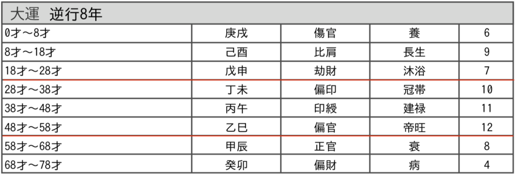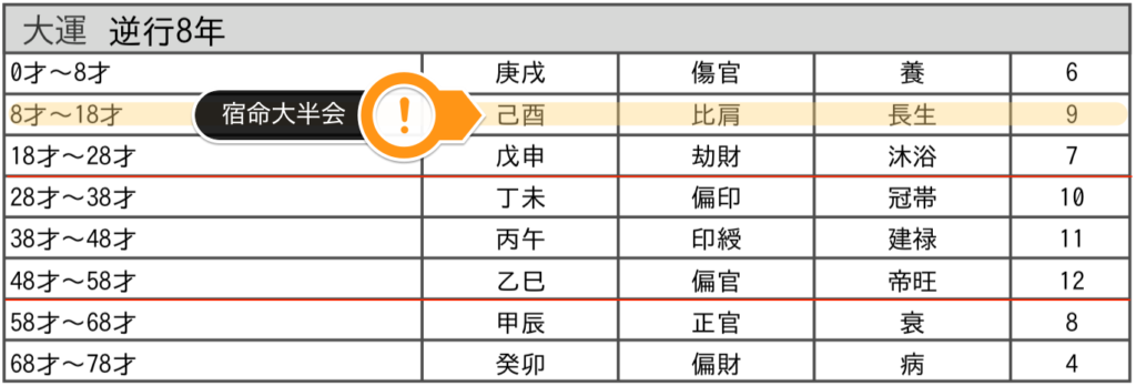 8歳〜18歳の10年に【己酉 つちのととり】という大運干支があるのがわかりますか?