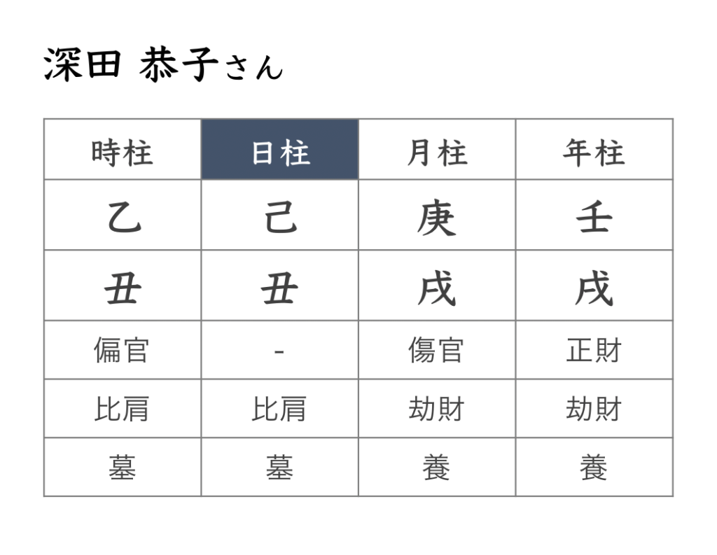 三柱(出生年月日)ではなく、四柱(出生年月日+出生時間)で命式を出してみると、深田恭子さんの特長がよりはっきりつかめるんです。