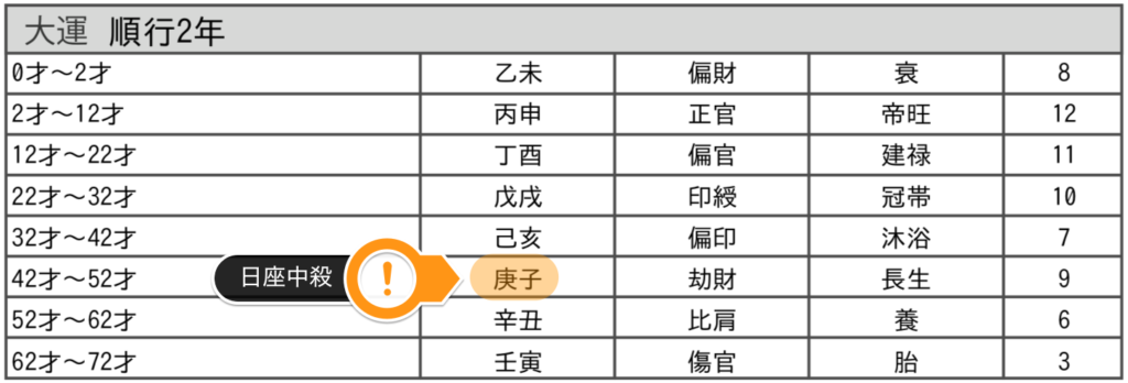 大運(42歳〜52歳)に日座中殺【庚子】が巡っていました。