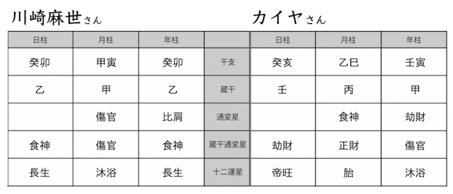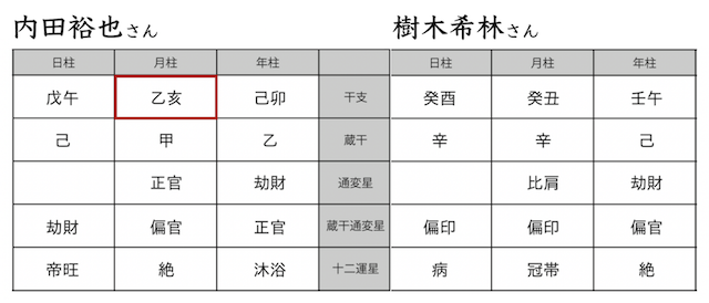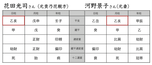 ふたりの命式を見ると、元貴乃花親方は日柱に、景子さんは月柱に日座中殺【乙亥 きのとい】があります。