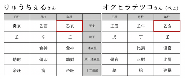りゅうちぇるさんとぺこさんご夫婦は、ふたりとも年柱に日座中殺【乙亥 きのとい】があります。