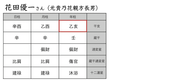 花田優一さんは、年柱に日座中殺【乙亥 きのとい】があります。