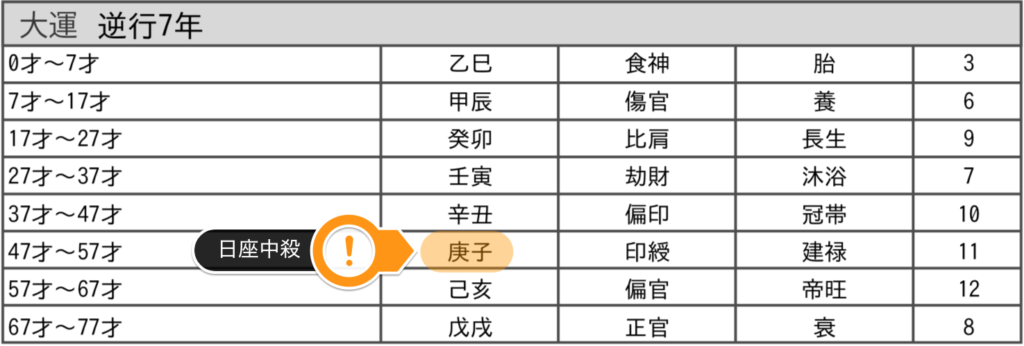 大運(47歳〜57歳)に日座中殺【庚子】が巡っていました。