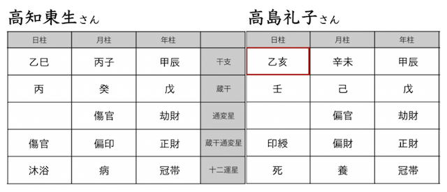 高島礼子さんの日柱に日座中殺【乙亥 きのとい】がありますが、高知東生さんの命式に日座中殺はありません。
