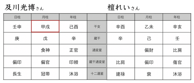 及川光博さんは月柱に日座中殺【甲戌 きのえいぬ】がありますが、檀れいさんの命式には日座中殺はありません。