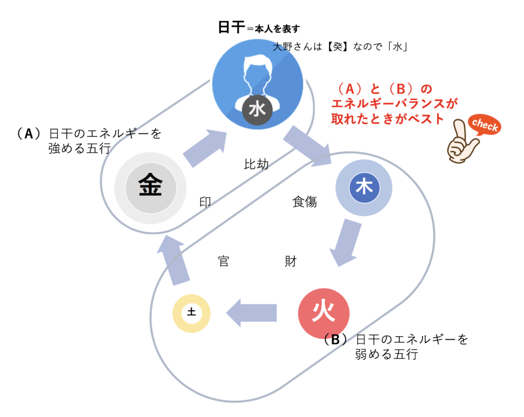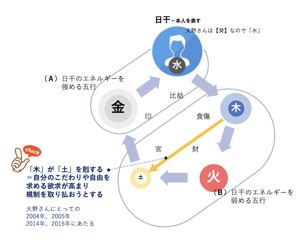 日干が「水」の五行の大野さんの場合、「土」の五行が運(大運や年運)で巡る時期に運気が動きます。