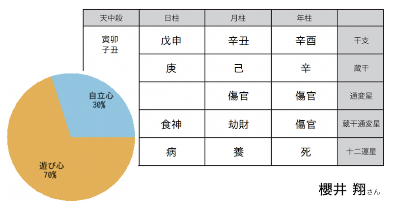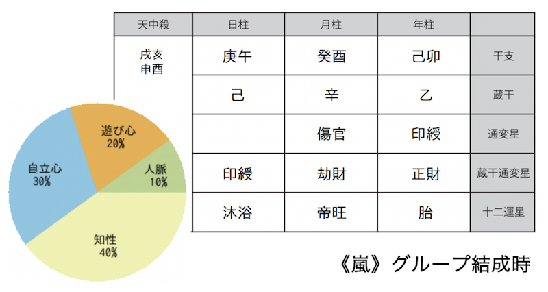 【劫財 / 帝旺】は強いリーダーの星であり、グループ《嵐》を象徴する星です。