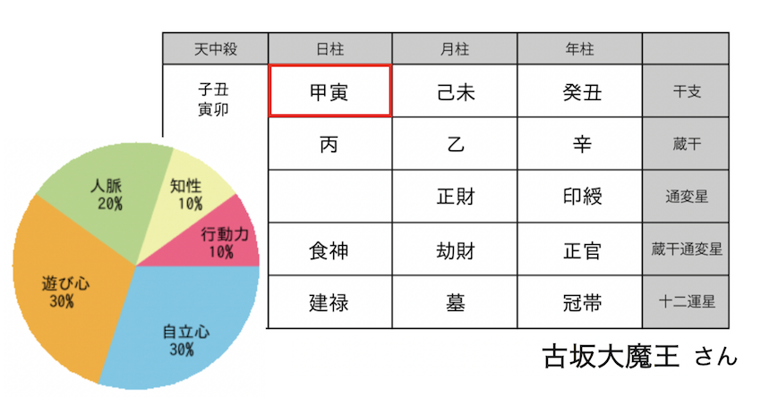 大運律音とは、古坂大魔王さん自身を表す日柱の干支【甲寅 きのえとら】が、2019年現在45歳の古坂大魔王さんの大運に、同じ干支が巡る状態をいいます。