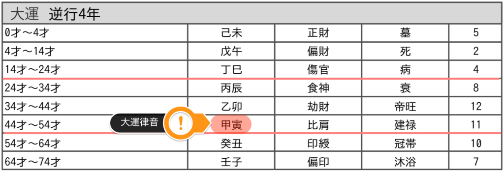 本人の運気を示す日柱の干支が大運を巡ることから、大運律音は通常の倍の成果が出せる10年間になるといわれています。