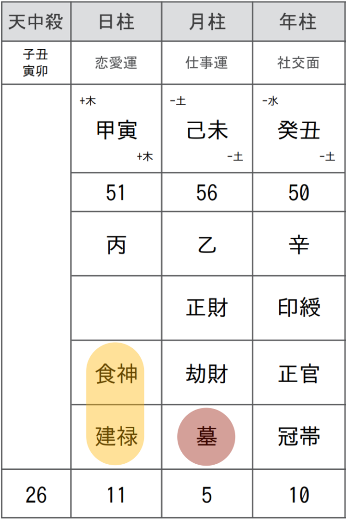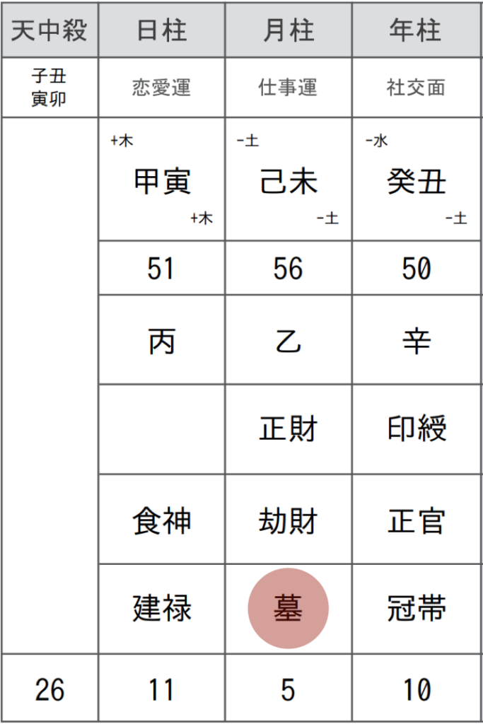 古坂大魔王さんの命式の月柱(仕事運や現在の年代の運を表す)には十二運星の【墓】があります。