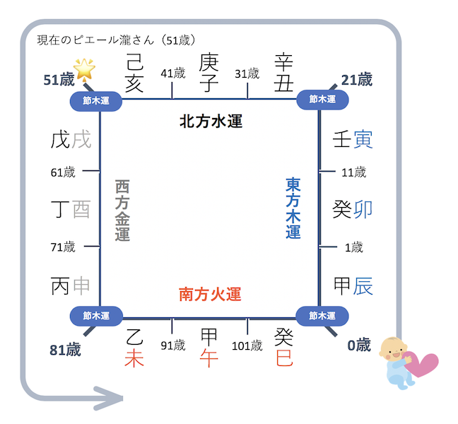 現在51歳のピエール瀧さんは、大運の切り替わり時期にあると同時に、30年周期の運気(接木運)の切り替わり時期でもあります。