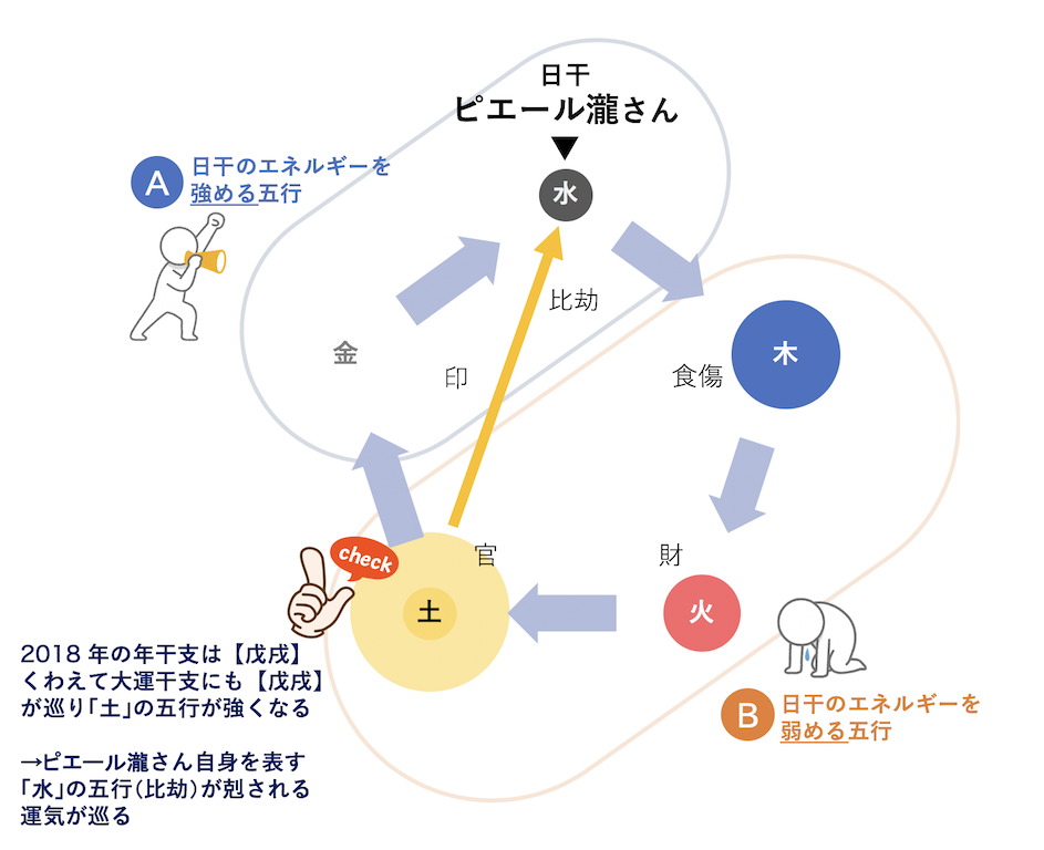 2018年に大運、年運に【戊戌(つちのえいぬ)】が巡り、「土」の五行(官)が非常に強くなったピエール瀧さんの命式は、この悪い効果が全面に顕れたかたちです。