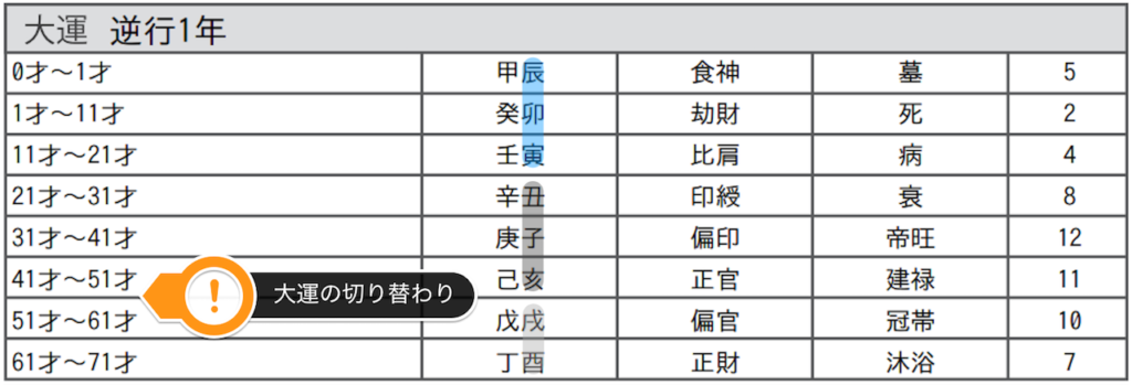 - この時期は、これまでの方向性を必然的に変えざるを得なくなるため、その前後の年回りは、新しい運気の流れに馴れるまで苦しい時期と感じやすい傾向がある