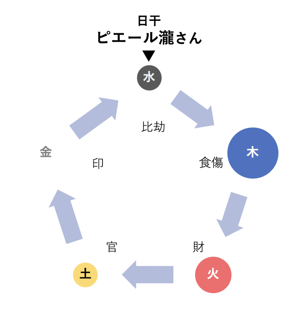 ピエール瀧さんの命式は、比劫(水の五行)と印(金の五行)が陥没し、食傷(木の五行)が突出しているタイプです。
