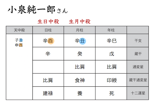 小泉純一郎さんは、宿命中殺だけでなく、日柱・月柱・年柱の3柱が〝ビジネス運が最強〟の宿命大半会も持っています。