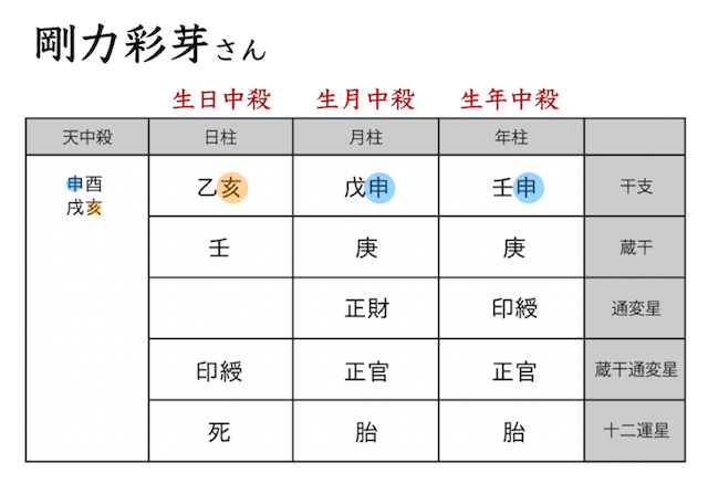 剛力彩芽さんも、山里亮太さんと同様に命式には宿命中殺が3つの宿命全中殺という非常に珍しいタイプの命式の持ち主です。