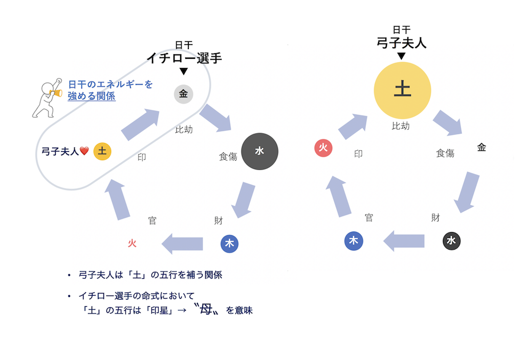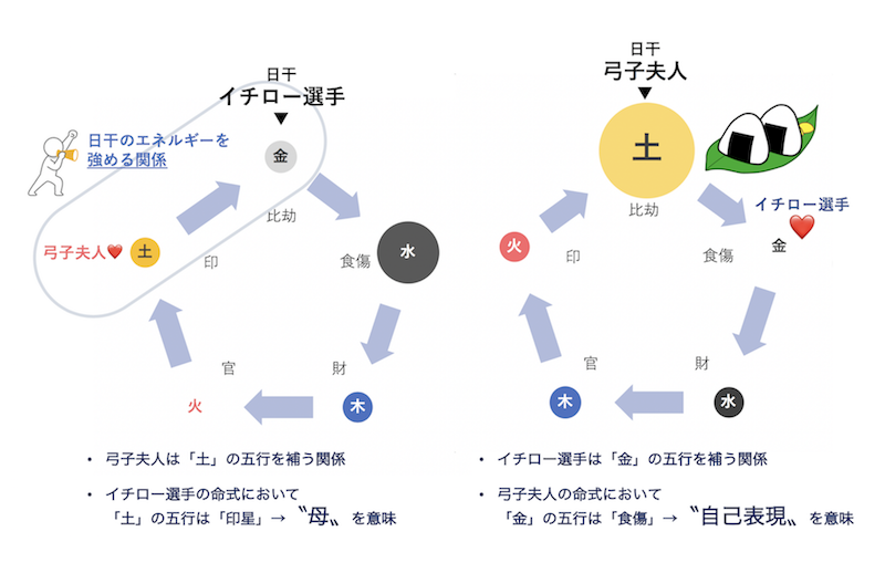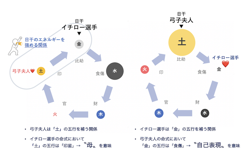 イチロー選手と出会い、結婚したことで、弓子夫人は自分自身の感情を表す喜びを覚え、弓子夫人自身の五行もうまく循環するようになりました。