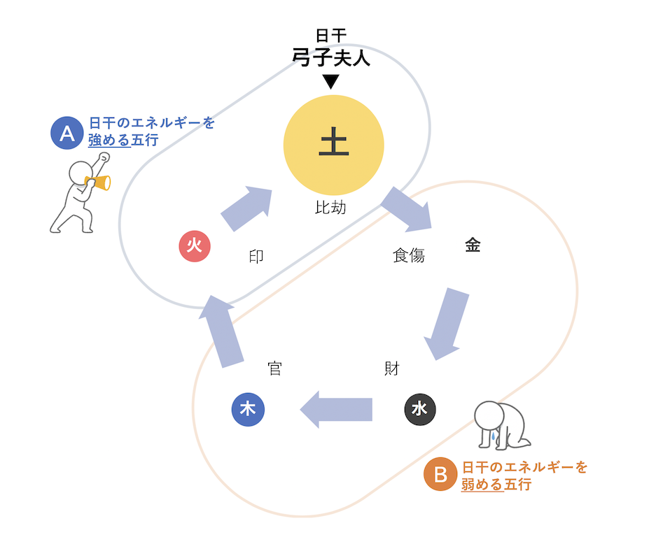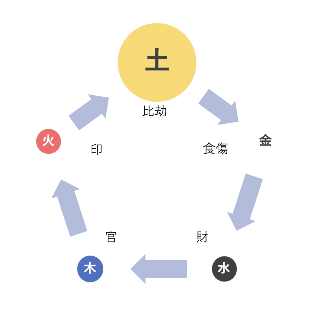弓子夫人自身を示す「比劫」は「土」の五行で、イチロー選手の「比劫」は「金」の五行です。