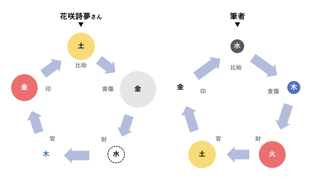 詩夢さんの五行バランスで強い「比劫」「食傷」「印」が、わたしの五行バランスでは弱く、かたや詩夢さんの五行バランスで弱い「財」「官」が、わたしの五行バランスでは強いことがわかります。
