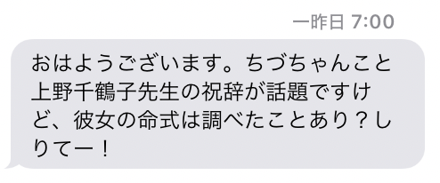 先週土曜の朝、東大入学式の祝辞の件で、友人とショートメールで盛り上がりました。