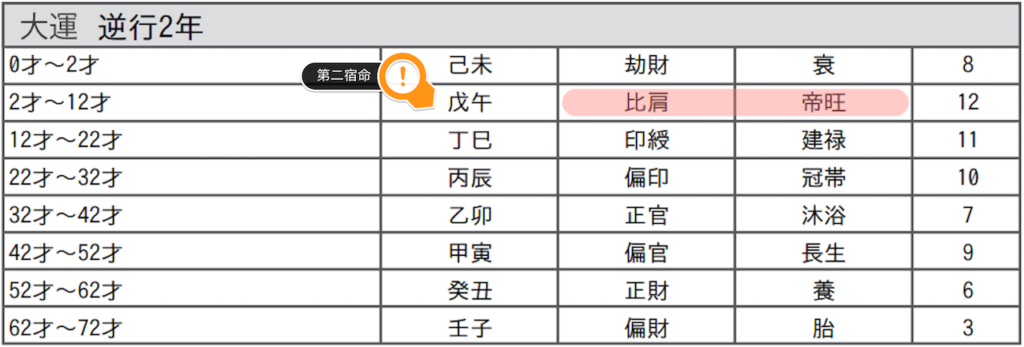 それが、上野さんの仕事運を示す月柱の【劫財+印綬+衰】と、上野さんの社会的使命(第二宿命)を表す大運の【比肩+帝旺】の星です。