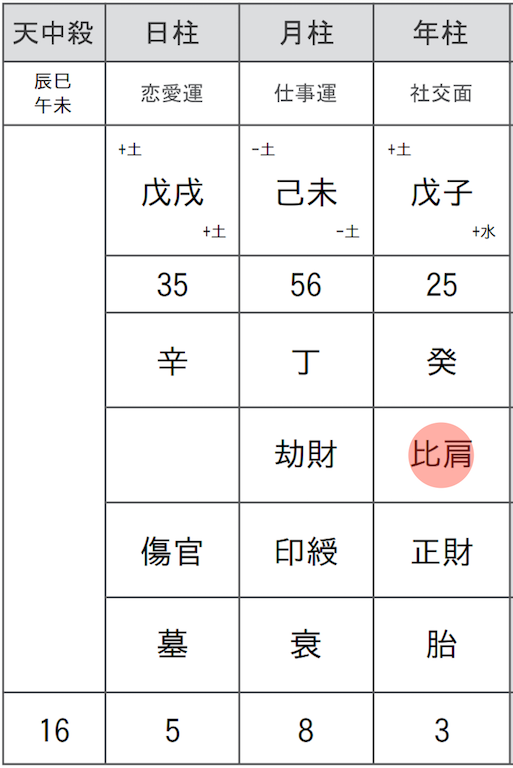 「年柱」と「第二宿命」にある【比肩】は、上野さんの命式のシンボリックな通変星です。