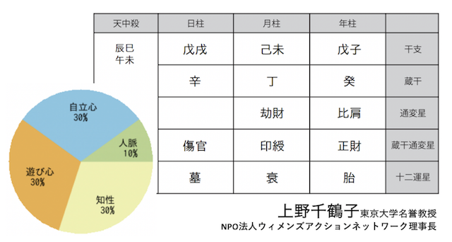 友人のリクエストに応えて、上野千鶴子さんの命式の特長について書いてみます。